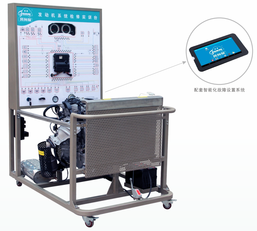 檢測控制面板,組合儀表,發(fā)動機(jī)控制電腦(ECU),診斷座,點火開關(guān),燃油壓力表,真空壓力表,發(fā)動機(jī)總成,燃油箱,汽油泵(含汽油泵插頭),油門控制裝置,進(jìn)、排氣管(帶保護(hù)罩),水箱(含不銹鋼保護(hù)罩),冷卻電子風(fēng)扇,蓄電池,繼電器,電源總開關(guān),智能化故障設(shè)置和考核系統(tǒng),移動臺架(帶自鎖腳輪裝置)