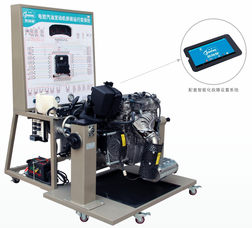 檢測控制面板,發(fā)動機控制電腦(ECU),組合儀表,診斷座,點火開關(guān),燃油壓力表,真空壓力表,燃油箱. 汽油泵(含汽油泵插頭),水箱,冷卻電子風扇,蓄電池,繼電器,對接線束,電源總開關(guān),智能化故障設(shè)置和考核系統(tǒng),移動臺架(帶自鎖腳輪裝置),電控汽油發(fā)動機總成,進、排氣管(帶保護罩),三元催化劑,對接線束,大面積接油盆,拆裝翻轉(zhuǎn)架(帶自鎖腳輪裝置)