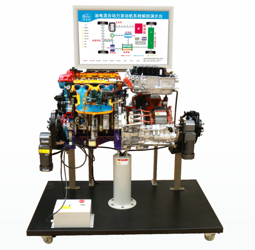 該產(chǎn)品采用豐田普銳斯混合動力系統(tǒng),并對其內(nèi)部結(jié)構(gòu)進行了切割。為了演示混合動力汽車的能量控制策略,配有LED燈的控制面板動態(tài)模擬混合動力力系統(tǒng)之間的能量流動方向,以及混合動力車輛啟動、低速、常速、全速、減咸速、停車時汽油由機MG1、MG2、高蓄電池的運行狀態(tài)。