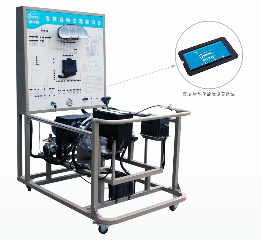 檢測控制面板,組合儀表,發(fā)動(dòng)機(jī)自動(dòng)變速器控制電腦(ECU),診斷座,點(diǎn)火開關(guān),壓力表,自動(dòng)變速器總成,節(jié)氣門總成,曲軸傳感器及信號盤,變速器檔桿總成,變速器油散熱裝置,三相異步電動(dòng)機(jī),變頻器,智能化故障設(shè)置和考核系統(tǒng),移動(dòng)臺架(帶自鎖腳輪裝置)