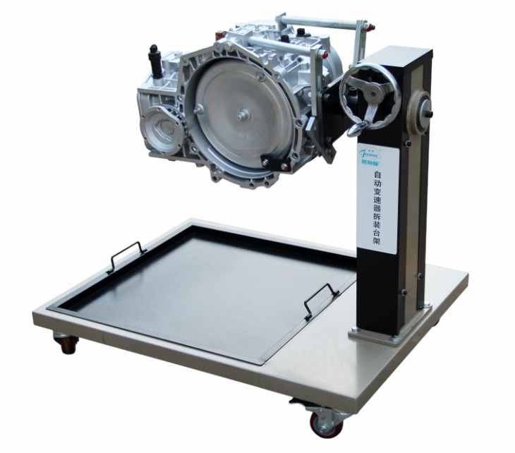 一、功能特點(注∶ 以大眾01M為例)(不同車型功能配置參數(shù)以實際為主)1. 采用大眾01M前驅(qū)自動變速器總成(易于拆裝),并裝在專用翻轉(zhuǎn)架上。2. 采用減速翻轉(zhuǎn)機構(gòu),可使變速器旋轉(zhuǎn)任意角度,并能任意位置鎖止,便于學生從不同的角度進行拆卸和裝配。 ,3. 底部放置接油盤,便于小零件或螺絲的集中存放。4. 翻轉(zhuǎn)架采用 了高強度的鋼結(jié)構(gòu)焊接,表面經(jīng)噴涂工藝處理。翻轉(zhuǎn)架底部帶有自鎖腳輪,可移動式,方便教