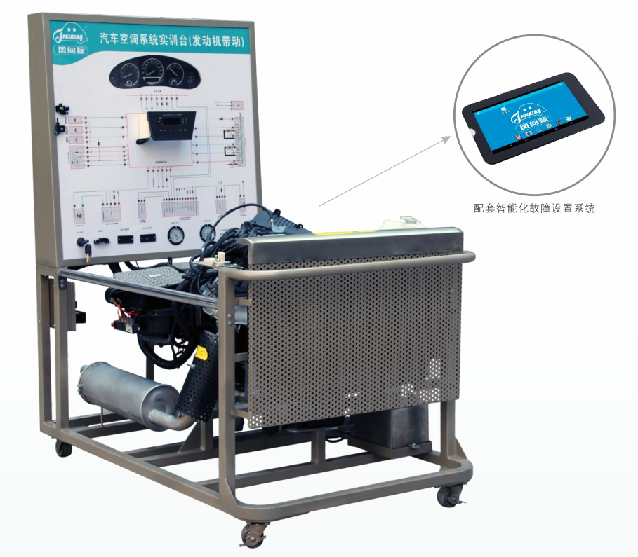 檢測控制面板,組合儀表,發(fā)動機控制電腦(ECU),車身控制電腦(ECU),診斷座,點火開關(guān),發(fā)動機總成,高壓壓力表,低壓壓力表,數(shù)字式進風口溫度表,數(shù)字式出風口溫度表,空調(diào)控制器總成,空調(diào)蒸發(fā)箱總成,壓縮機總成,膨脹閥總成,干燥器總成,鼓風機總成,冷凝器,燃油箱,汽油泵(含汽油泵插頭)油門控制裝置。進排氣管(帶保護置)。 水箱(含不銹鋼保護罩),冷卻電子風扇,蓄電池,電源總開關(guān),智能化故障設(shè)置和考核系統(tǒng),移動臺架(帶自鎖腳輪裝置)