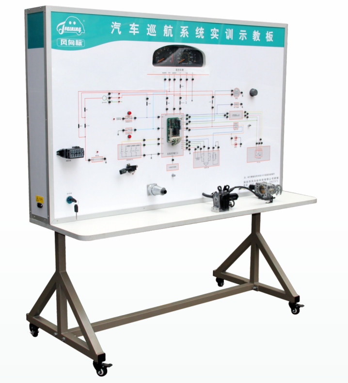 3. 示教板面板采用4mm厚耐腐蝕、耐創(chuàng)擊、耐污染、防火、防潮的高級鋁塑板,表面經(jīng)特殊工藝噴涂底漆處理∶ 面板打印有永不褪色的彩色電路圖,表面噴涂光油; 學(xué)員可直觀對照電路圖和實物,認(rèn)識和分析汽車巡航系統(tǒng)的工作原理。