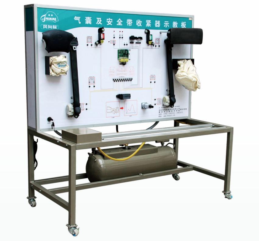 檢測控制面板,安全氣囊ECU,點火開關(guān),診斷座,駕駛側(cè)安全氣囊模擬袋,乘客側(cè)安全氣囊模擬袋,碰撞小車,碰撞導軌,空氣管路,儲氣罐,氣壓表,安全閥,排氣閥,排污閥,智能故障設(shè)置和考核系統(tǒng),移動臺架(帶自鎖腳輪)