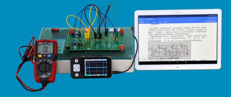 2、配套的有∶帶有各種電壓輸出的通用試驗主板模塊,示波器,萬用表,一字頭螺絲刀,9.8寸平板電腦,兩端帶有香蕉插座的連接線,平板電腦和示波器充電用數(shù)據(jù)線,電源線。