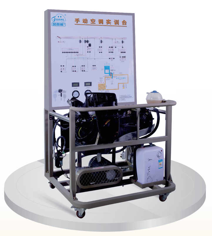 檢測控制面板、點火開關(guān)、高壓壓力表、低壓壓力表、數(shù)字式進風(fēng)口溫度表、數(shù)字式出風(fēng)口溫度表、空調(diào)控制器總成、空調(diào)開關(guān)、空調(diào)蒸發(fā)器總成、壓縮機總成、膨脹閥總成、干燥器總成、鼓風(fēng)機總成、冷凝器總成、加熱器、循環(huán)水泵、冷卻電子風(fēng)扇、三相異步電動機、真空泵、智能化故障設(shè)置和考核系統(tǒng)、移動臺架(帶自鎖腳輪裝置)。