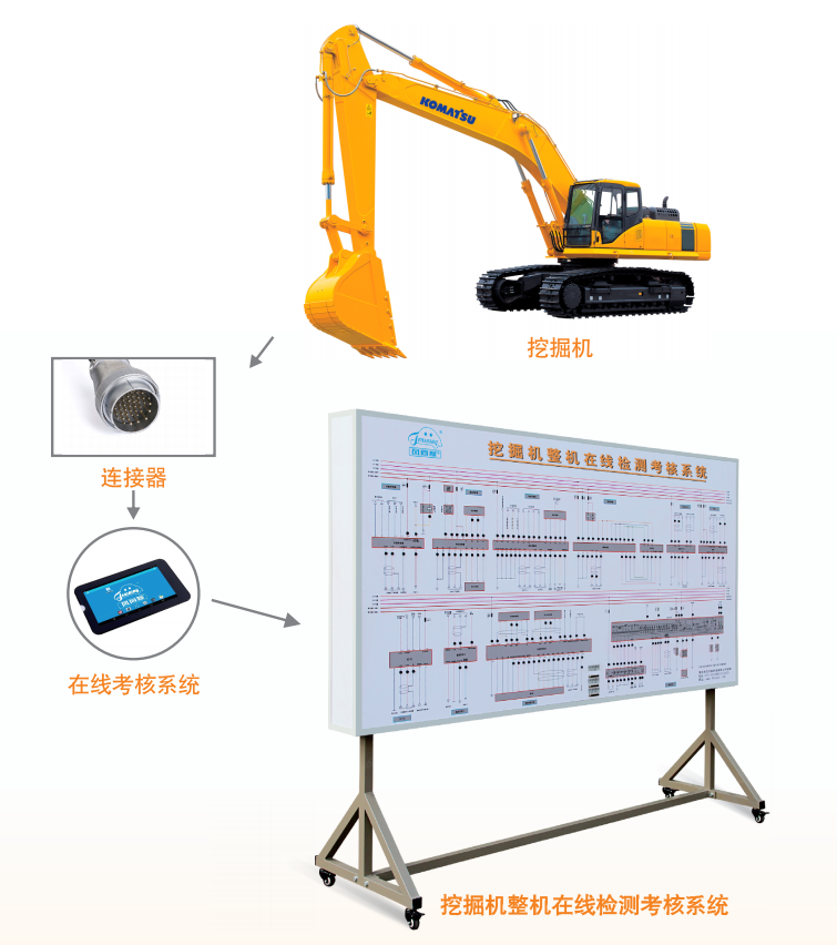 該設備將小松PC200-8原廠整機改裝為在線檢測教具挖掘機,可實現(xiàn)檢測與診斷挖掘機IECU、EECU、 VECU及自動空調(diào)控制單元、各電磁閥、傳感器動靜態(tài)信號參數(shù)。適合于挖掘機整機操作、維修實踐、整車理論、電液故障設置及考核的教學需要。