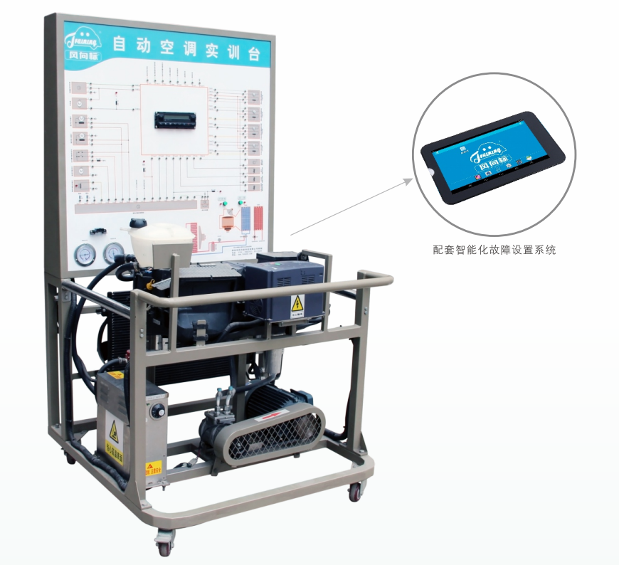 檢測(cè)控制面板,診斷座,點(diǎn)火開關(guān),信號(hào)模擬信號(hào)板,高壓壓力表,低壓壓力表,數(shù)字式進(jìn)風(fēng)口溫度表,數(shù)字式出風(fēng)口溫度表,空調(diào)控制器總成,空調(diào)蒸發(fā)箱總成,壓縮機(jī)總成,膨脹閥總成,干燥器總成,鼓風(fēng)機(jī)總成,冷凝器,加熱器,循環(huán)水泵,冷卻電子風(fēng)扇,三相異步電動(dòng)機(jī),智能化故障設(shè)置和考核系統(tǒng),移動(dòng)臺(tái)架(帶自鎖腳輪裝置)