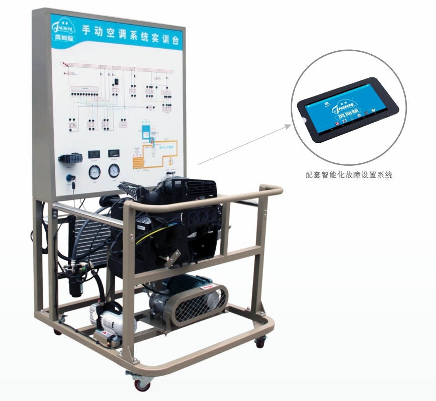 檢測控制面板,點(diǎn)火開關(guān),高壓壓力表,低壓壓力表,數(shù)字式進(jìn)風(fēng)口溫度表,數(shù)字式出風(fēng).口溫度表,空調(diào)控制器總成,空調(diào)蒸發(fā)箱總成,壓縮機(jī)總成,膨脹閥總成,干燥器總成,鼓風(fēng)機(jī)總成,冷凝器,冷卻電子風(fēng)扇,三相異步電機(jī),真空泵,智能化故障設(shè)置和考核系統(tǒng),移動臺架(帶自鎖腳輪裝置)
